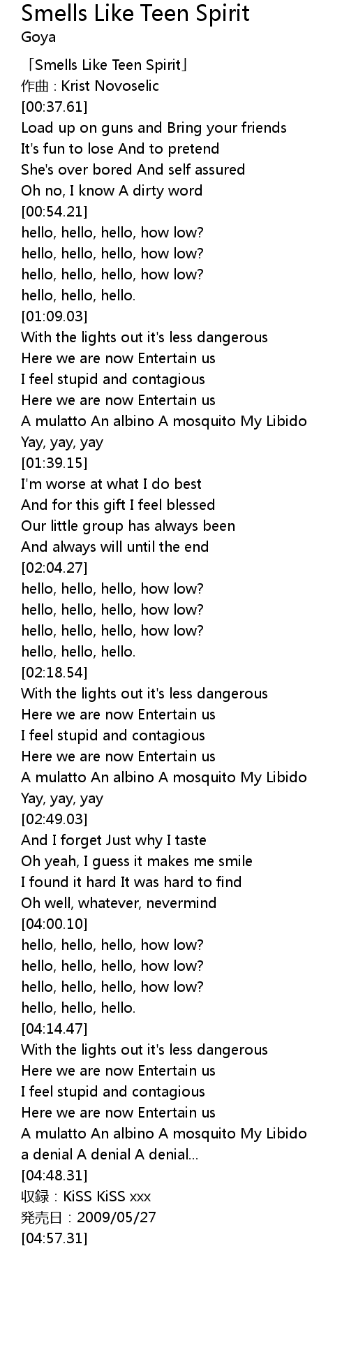 | [04:18.99] | Here we are now Entertain us |