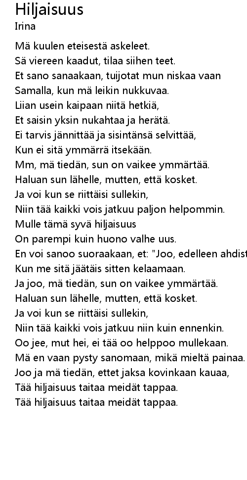 | Tää hiljaisuus taitaa meidät tappaa. | |