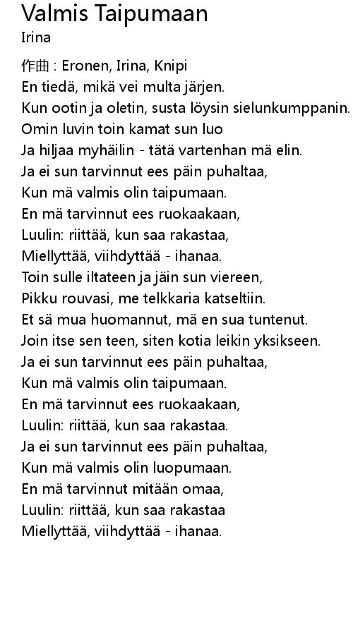 | Song | Valmis Taipumaan |