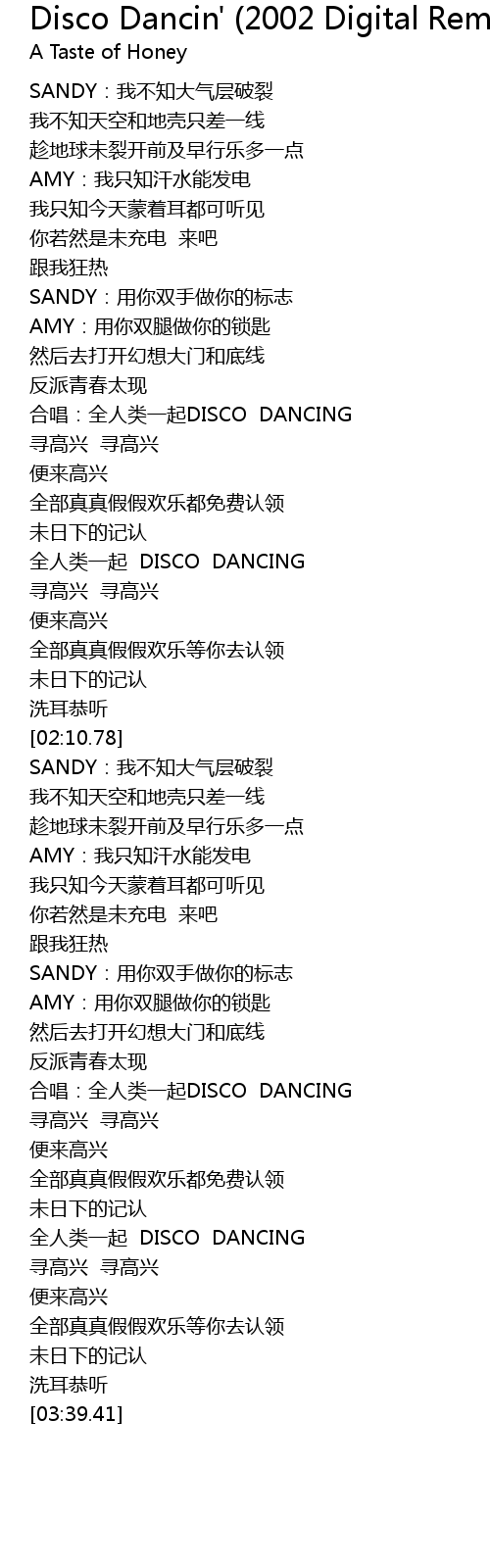 | [03:19.18] | 全人类一起 DISCO DANCING |