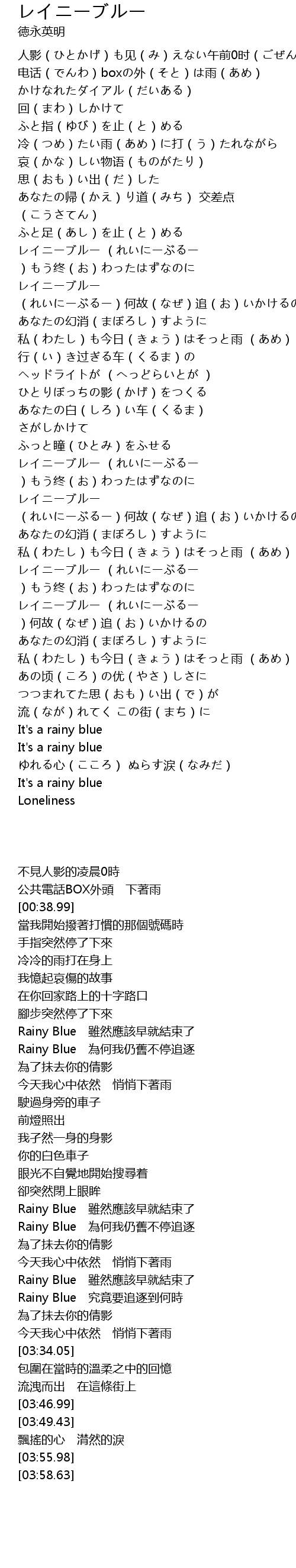| [03:08.68] | レイニーブルー (れいにーぶるー )もう终(お)わったはずなのに |