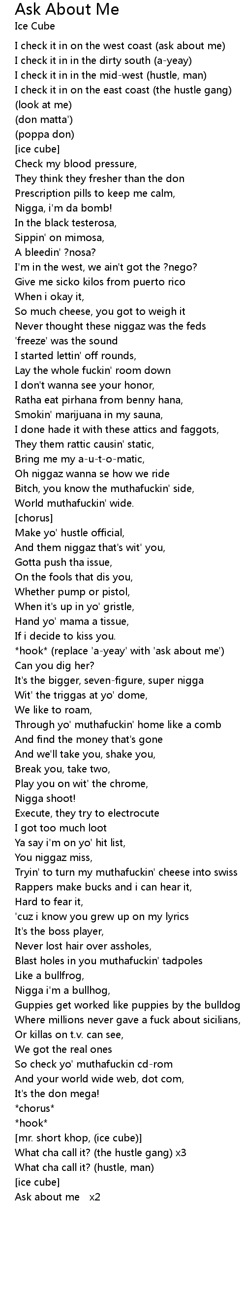 | *hook* (replace 'a-yeay' with 'ask about me') | |