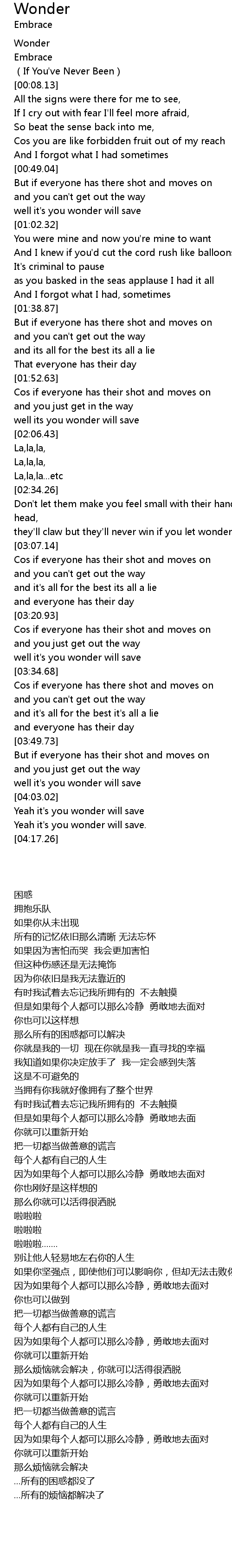 | [04:03.94] | Yeah it' s you wonder will save |