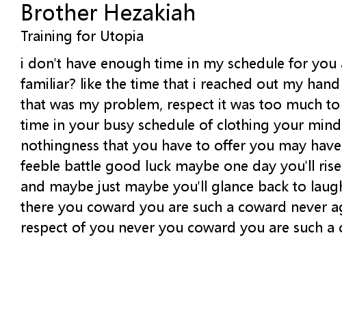 i don't have enough time in my schedule for you anymore does this thought sound familiar? like the time that i reached out my hand and uttered a word of respect that was my problem, respect it was too much to ask of you if you could find time in your busy schedule of clothing your mindless victims in the absolute nothingness that you have to offer you may have noticed me cheering on your feeble battle good luck maybe one day you'll rise to the top of our great scene and maybe just maybe you'll glance back to laugh at those you crushed to get there you coward you are such a coward never again will i reach out my hand in respect of you never you coward you are such a coward |