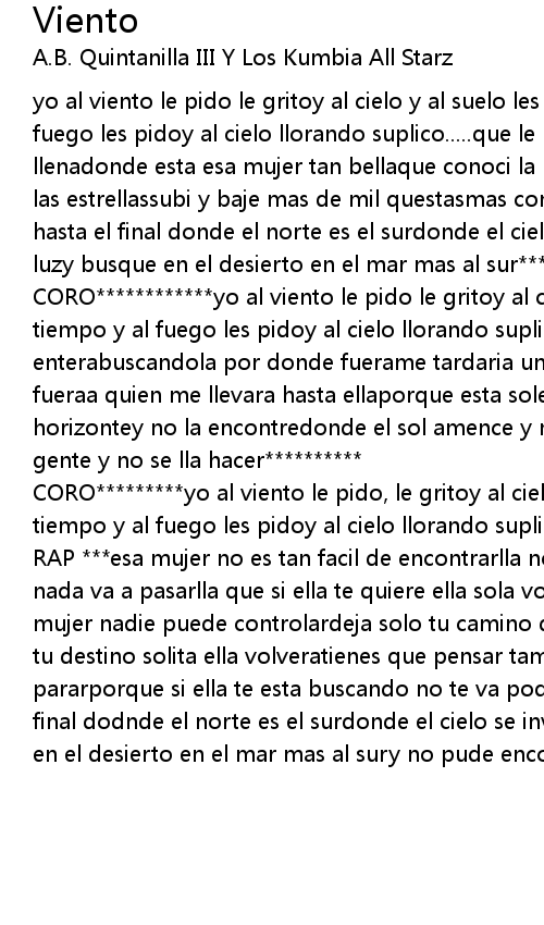 CORO************yo al viento le pido le gritoy al cielo y al suelo les digoy al tiempo y al fuego les pidoy al cielo llorando suplicoque me pasaria la vida enterabuscandola por donde fuerame tardaria una primaverayo entregaria lo que fueraa quien me llevara hasta ellaporque esta soledad me quemay busque en el horizontey no la encontredonde el sol amence y no la pude very busque entre la gente y no se lla hacer********** |
