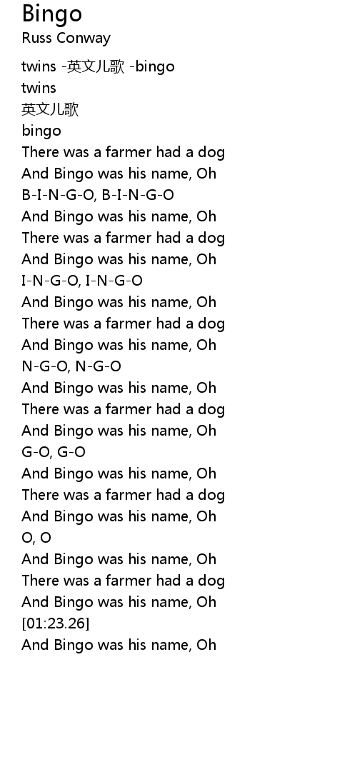 | [00:09.28] | B-I-N-G-O, B-I-N-G-O |