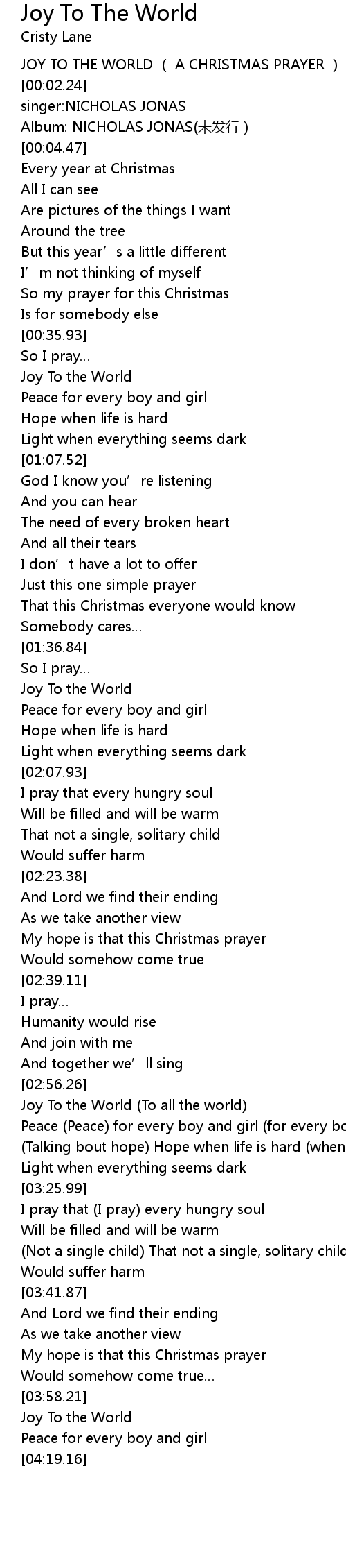 | [00:00.93] | JOY TO THE WORLD A CHRISTMAS PRAYER |