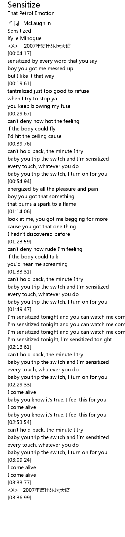 | [00:43.21] | baby you trip the switch and I' m sensitized |