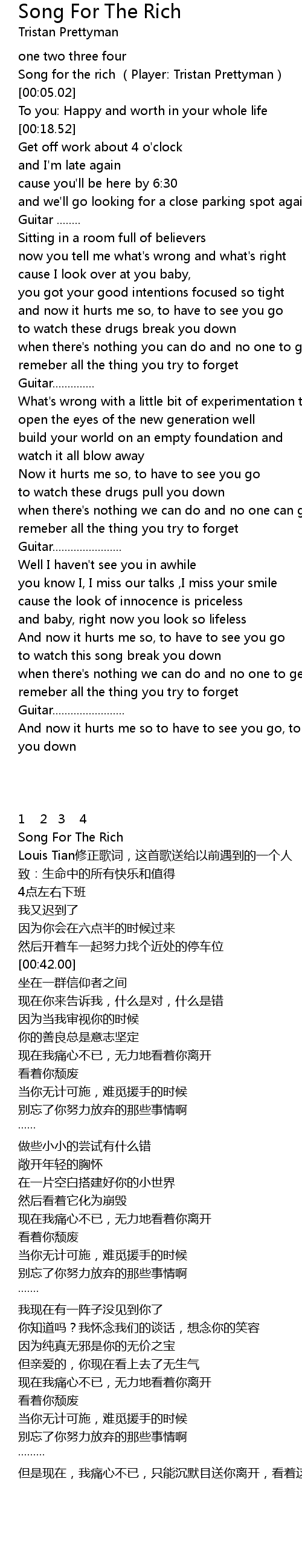 | [00:03.76] | Song for the rich (Player: Tristan Prettyman) |