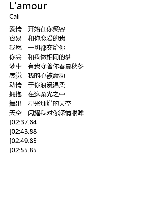 | [03:08.17][02:43.88][01:55.41][01:31.21] | LA' MOUR he ni jin jin xiang yong |