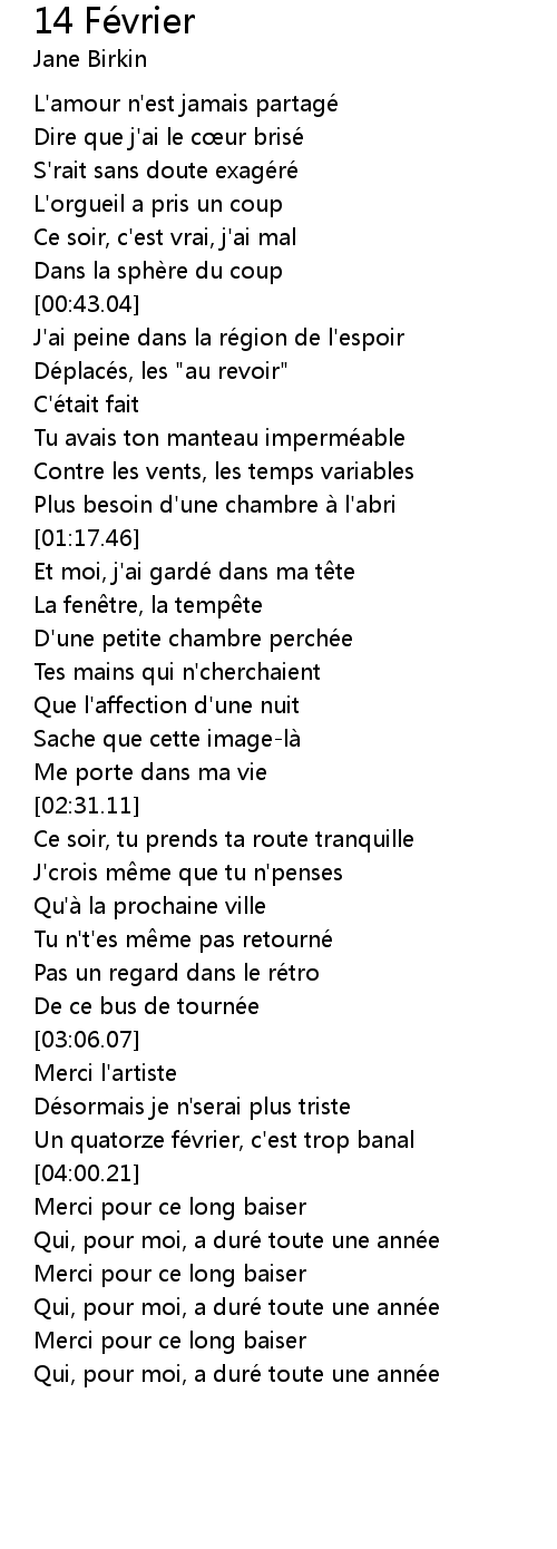 | [03:53.83] | Un quatorze fe vrier, c' est trop banal |