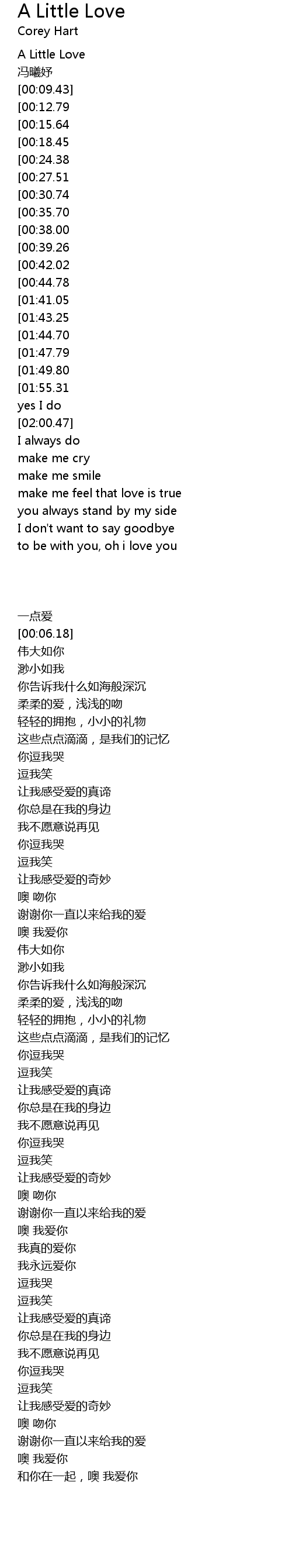| [01:17.64][00:24.38] | a little love, little kiss |