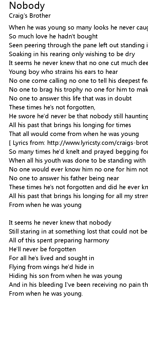 [ Lyrics from: http://www.lyricsty.com/craigs-brother-nobody-lyrics.html ] |