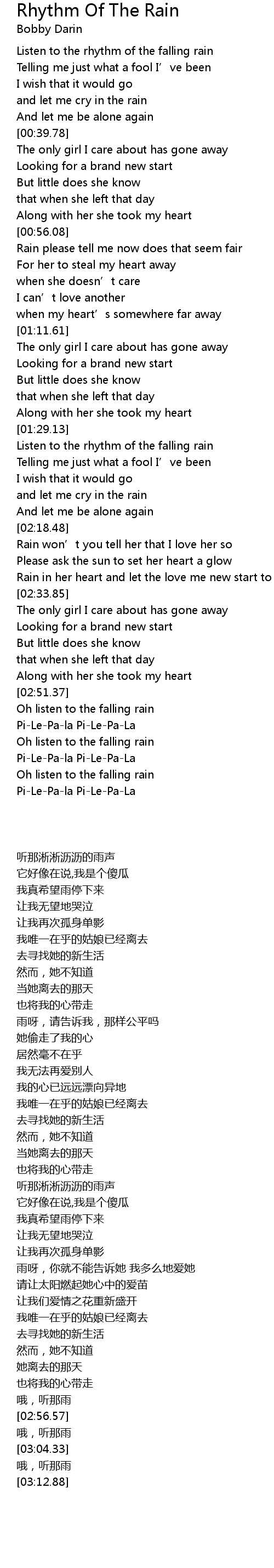 | [02:59.00] | Oh listen to the falling rain |