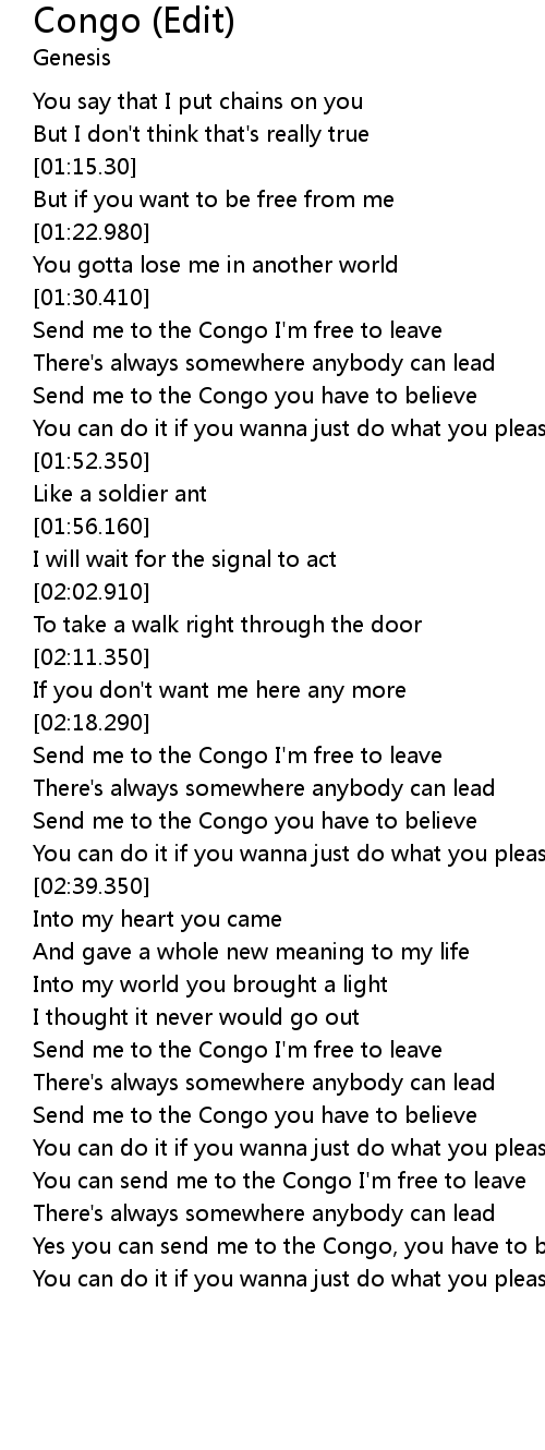 | [01:41.100] | Send me to the Congo you have to believe |