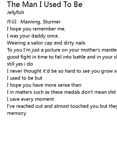 | To you I'm just a picture on your mother's mantlepiece who chose to fight the good fight in time to fail into battle and in your shadow your daddy loves you still yes i do | |