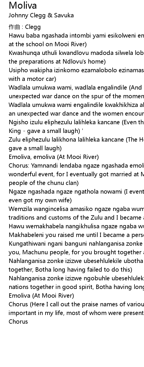 | Chorus: Yamnandi lendaba ngaze ngashada emoliva ngiyabonga webanguni (It was a wonderful event, for I eventually got married at Mooi River and I thank you people of the chunu clan) | |