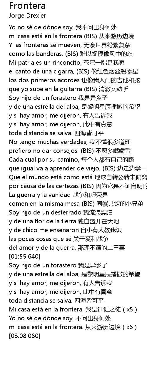 | [02:55.320] | mi casa está en la frontera. 从来游历边境(x6) |