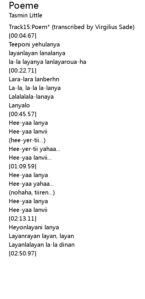 | [00:01.35] | Track15:Poem* (transcribed by Virgilius Sade) |