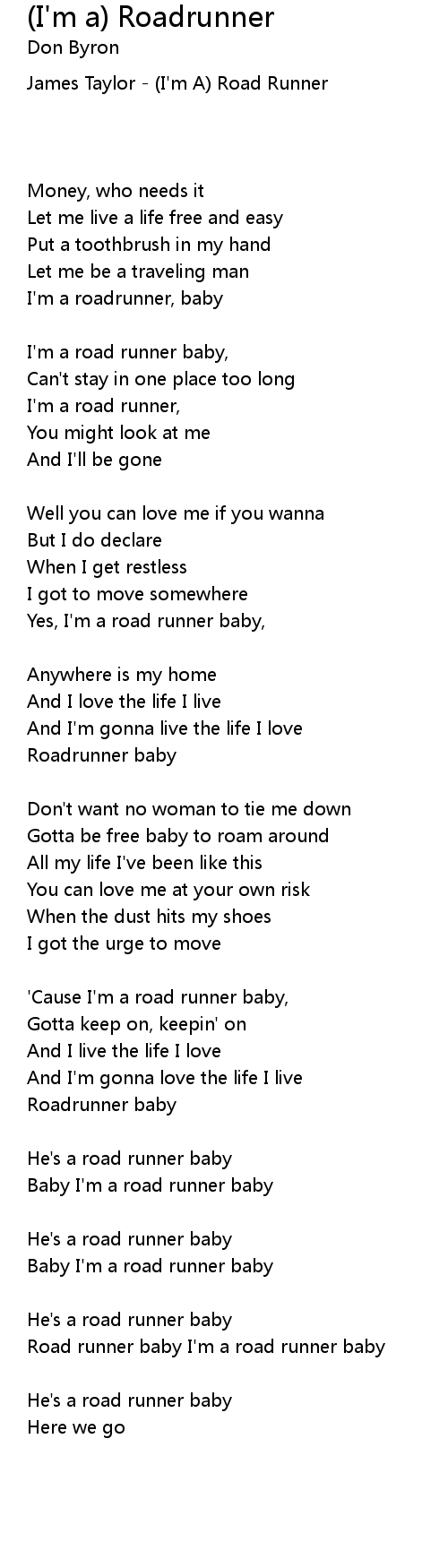 Road runner baby I'm a road runner baby |