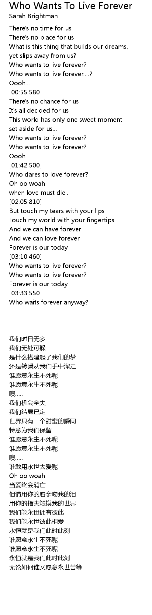 | [03:20.410] | Who wants to live forever? |
