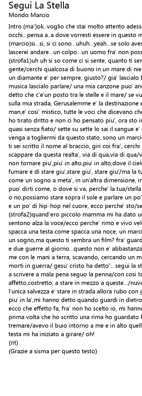 (strofa1)uh uh si so come ci si sente, quanto ti senti solo anke in mezzo alla gente/cerchi qualcosa di buono in un mare di niente,i soldi non fanno l'uomo ma un diamante e' per sempre, giusto?/ gia' lascialo brillare,un marcio vuole fare musica lascialo parlare/ una mia canzone puo' anche farti volare, non ti hanno detto che c'e'un posto tra le stelle e il mare/ se vuoi ti ci posso portare,e' sulla mia strada, Gerusalemme e' la destinazione e l'arrivo e' in nottata/ ah man,e' cosi' mistico, tutte le voci che dicevano che sarei andato giu'/ma vedi ho tirato dritto e non ci ho pensato piu', ora sto inseguendo un bagliore e sono quasi senza fiato/ sette su sette lo sai il sangue e' congelato,sperando che Dio venga a togliermi da questo stato, sono un marcio/(rit)sei un marcio e vivi qua, ti sei scritto il nome al braccio, giri coi fra', cerchi un aggancio per scappare da questa realta', via di qua,via di qua/via dal fumo e la citta'/per non tornare piu',piu' in alto,piu' in alto,dove il cielo e' blu e sei stanco di fumare e di stare giu',stare giu', stare giu'/ma la tua stella arrivera'/e sara' come un sogno a meta', in un'altra dimensione, in un'altra realta', e nessuno puo' dirti come, o dove si va, perche' la tua/stella e' la tua volonta'/credici o no,possiamo stare sopra il sole e parlare un po',perche' ognuno ha una canzone e un po' di hip-hop nel cuore, ecco perche' sto/seguendo la mia stella |