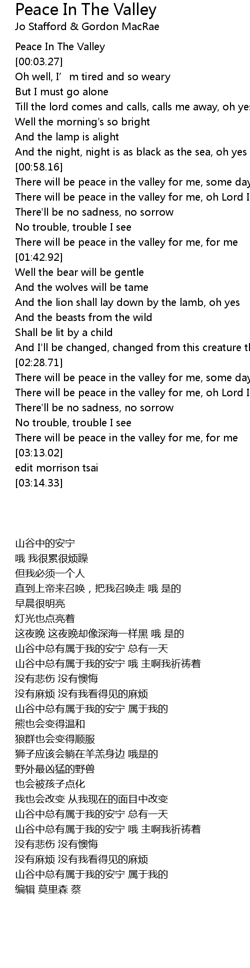 | [03:04.22] | There will be peace in the valley for me, for me |