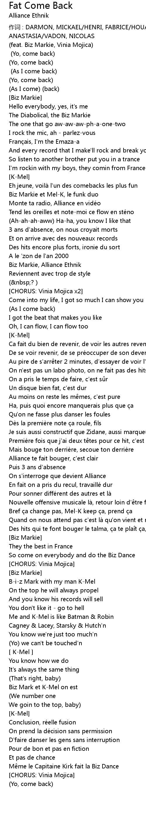 | 作词 : DARMON, MICKAEL/HENRI, FABRICE/HOUAIRI, KAMEL/MOJICA, VINIA ANASTASIA/VADON, NICOLAS | |