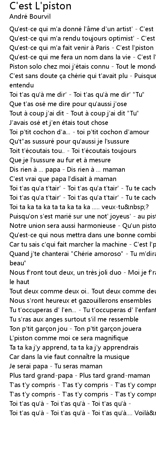 | Qu' estce qui m' a fait venir à Paris C' est l' piston | |