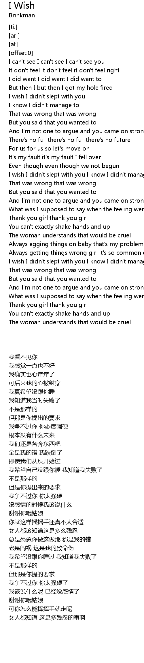 | [02:09.08] | I wish I didn't slept with you I know I didn't manage to |