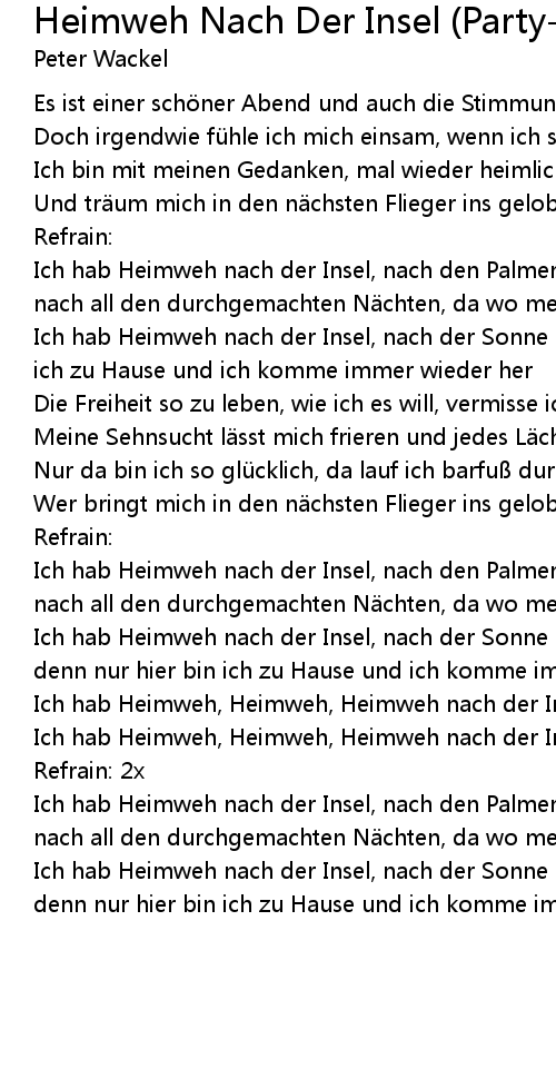 | Ich hab Heimweh nach der Insel, nach der Sonne und dem Meer, denn nur hier bin ich zu Hause und ich komme immer wieder her | |