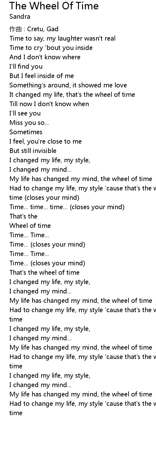 | Had to change my life, my style ' cause that' s the wheel, that' s the wheel of time | |