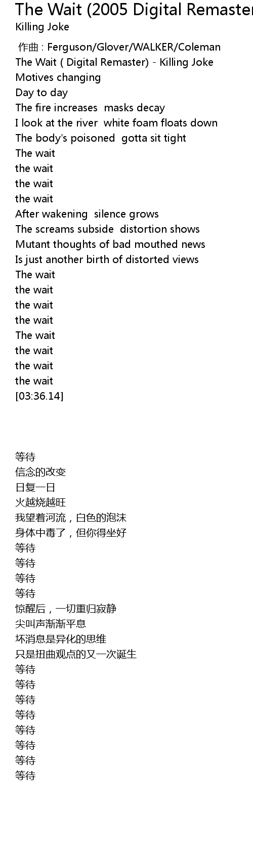 | [00:05.64] | The Wait Digital Remaster Killing Joke |