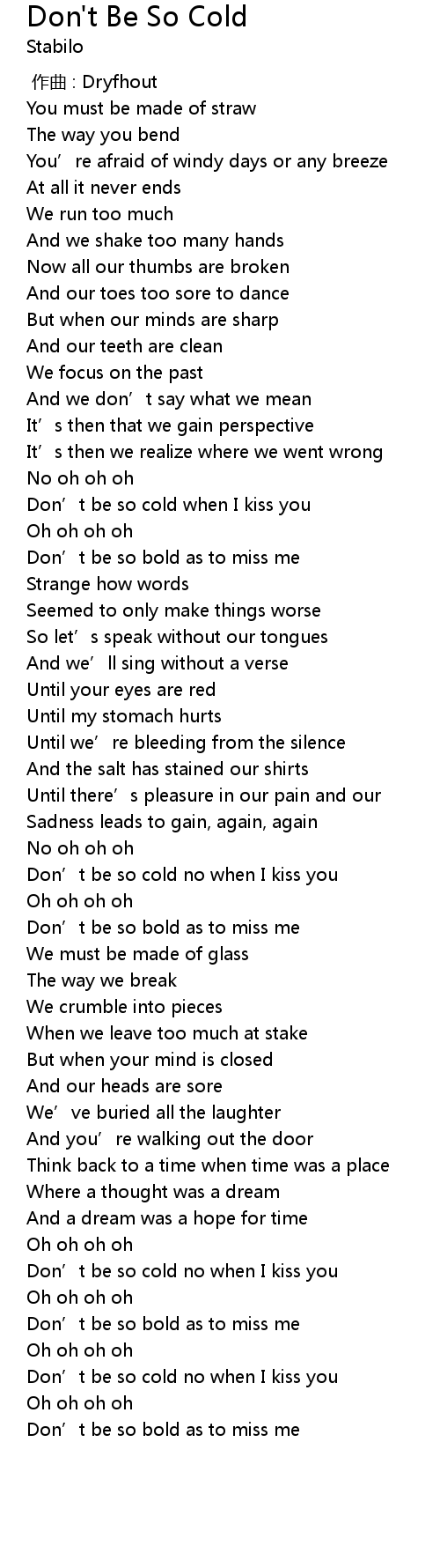 | [03:51.52] | Don’t be so cold no when I kiss you |