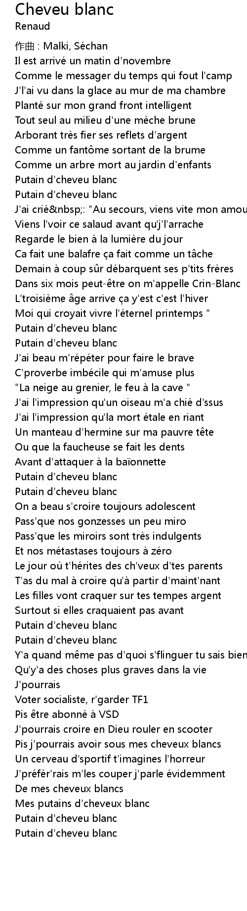 | Pis j' pourrais avoir sous mes cheveux blancs | |