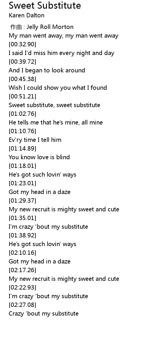 | [00:55.73] | Sweet substitute, sweet substitute |
