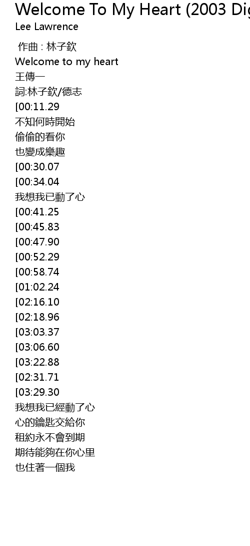 | [03:19.65][03:06.60][02:25.76][01:15.04] | Welcome to my heart |