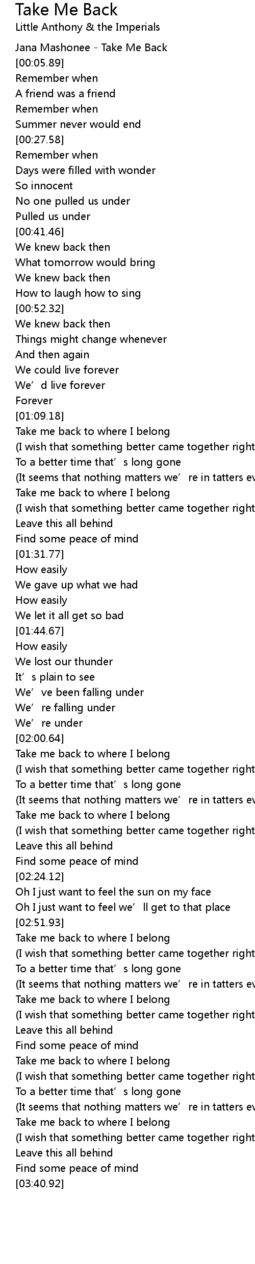 | [02:13.18] | Take me back to where I belong |