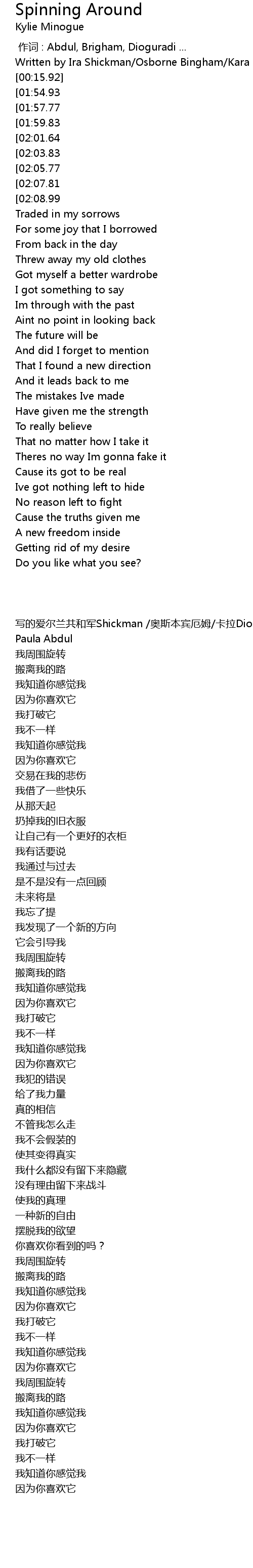 | [02:34.11][01:54.93][01:06.92][00:18.97] | Im spinning around |