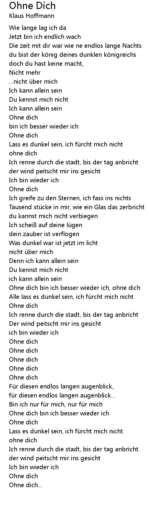 | [01:45.65] | Ohne dich bin ich besser wieder ich, ohne dich |
