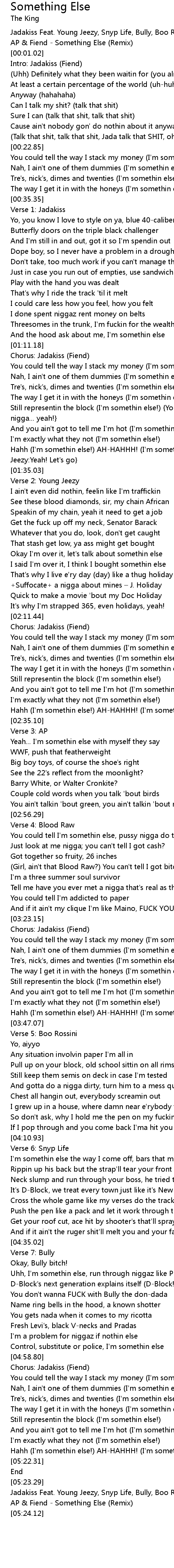 | [00:00.02] | Jadakiss Feat. Young Jeezy, Snyp Life, Bully, Boo Rossini, Blood Raw, AP & Fiend - Something Else (Remix) |