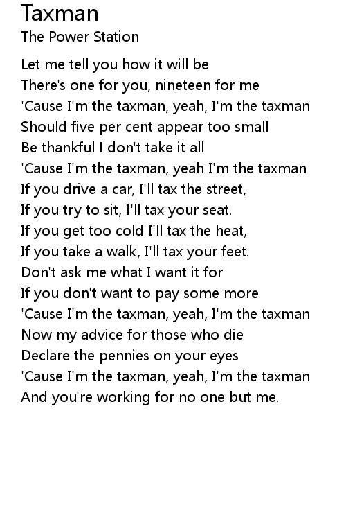 'Cause I'm the taxman, yeah, I'm the taxman |