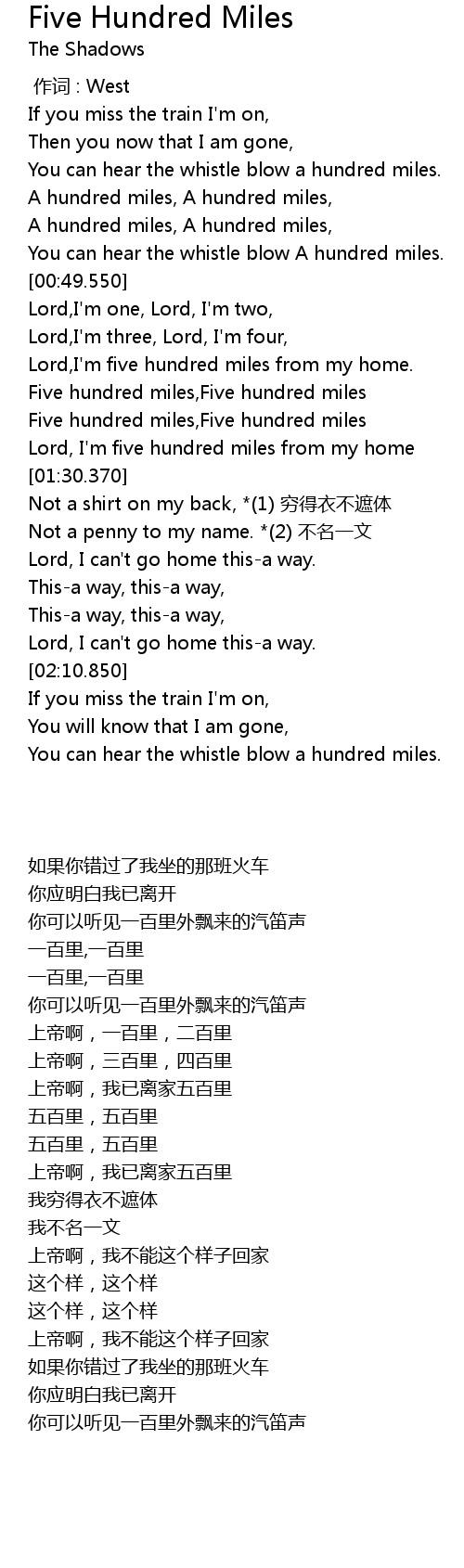 | [01:09.480] | Five hundred miles, Five hundred miles |