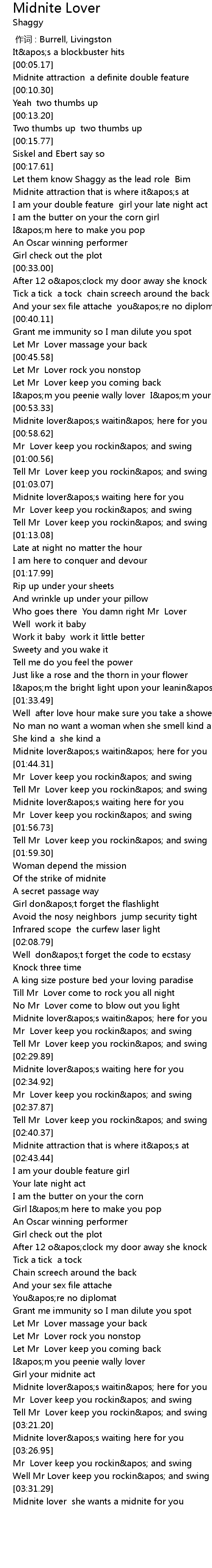| [03:32.22] | Midnite lover she wants a midnite for you |