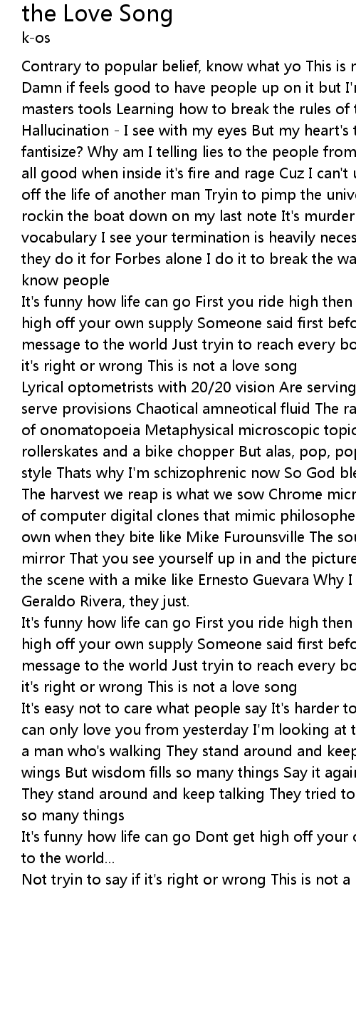 Contrary to popular belief, know what yo This is not a lovesong It's a sonnett Damn if feels good to have people up on it but I'm just a fool playing with the masters tools Learning how to break the rules of this record company coup Hallucination - I see with my eyes But my heart's telling me lies Why do I fantisize? Why am I telling lies to the people from the stage Pretending it's all good when inside it's fire and rage Cuz I can't understand how a man lives off the life of another man Tryin to pimp the universe - that's a joke I stay rockin the boat down on my last note It's murder she wrote Assassination vocabulary I see your termination is heavily necessary I should have known - they do it for Forbes alone I do it to break the walls if I fell off then let me know people |