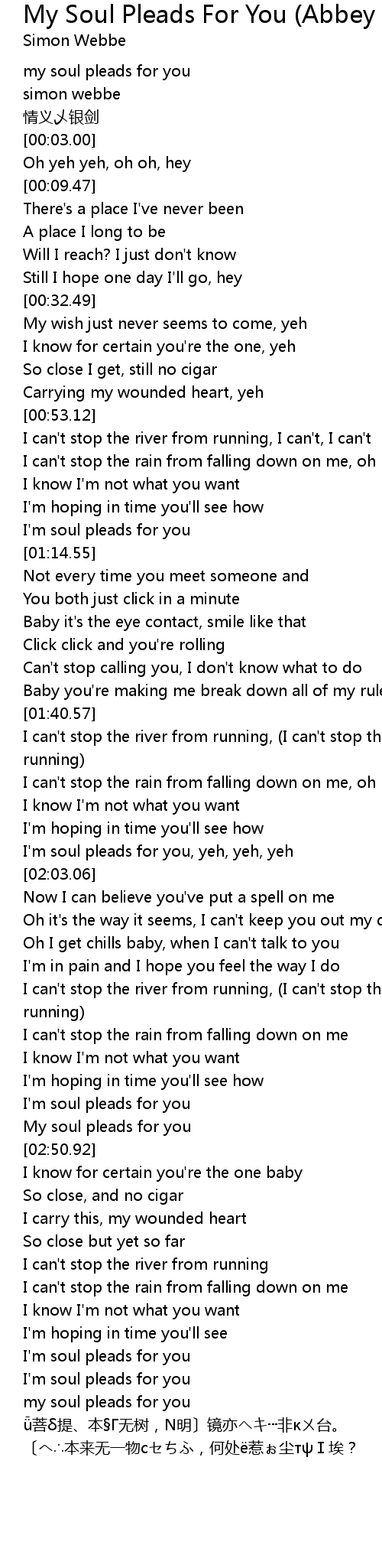 | [01:57.43] | I'm soul pleads for you, yeh, yeh, yeh |