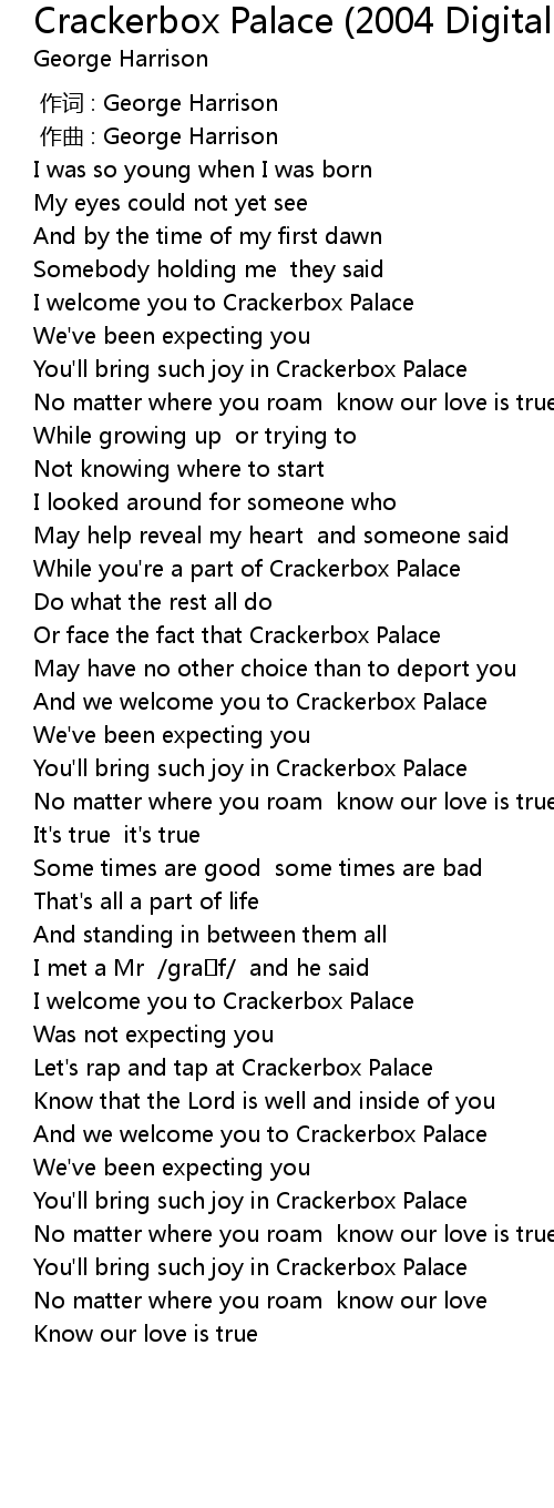 | [00:32.710] | I welcome you to Crackerbox Palace |