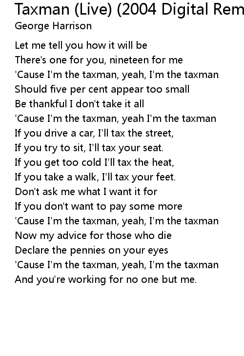 'Cause I'm the taxman, yeah, I'm the taxman |