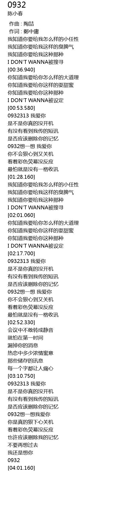 | [03:13.200] | 0932313 wǒ ài nǐ |