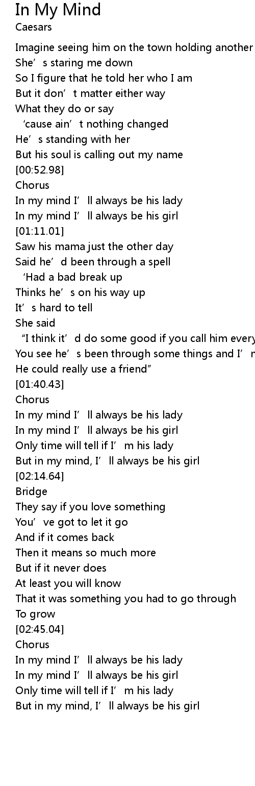 | [03:11.94] | But in my mind, I' ll always be his girl |